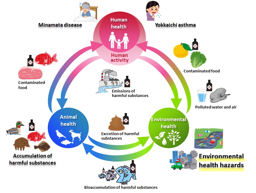 For example, in zoonotic diseases, such as a novel coronavirus infection, both humans and animals become infected because of changes in wildlife habitats and increased opportunities for contact between humans and animals as their living areas increasingly overlap. This situation has resulted from excessive development of forest areas and global warming caused by greenhouse gas emissions from human activities (Figure 2). Additionally, environmental health hazards affects human health directly via polluted water and/or air containing harmful substances derived from human activity. Minamata disease is caused by the ingestion of contaminated food (fish) (Figure 3). From the One Health perspective, these two cases are examples in which human activities affect environmental health and animal health, resulting in a negative effect on human health.