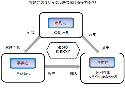 | 現況 容器包装廃棄物は家庭ごみに占める割合が高く、容積比で約5 割、重量比で約2 割に達しており、その減量化が課題となっています。 「容器包装リサイクル法」が平成7 年6 月に制定され、 平成9 年4 月から本格施行、平成12年4 月から完全施行されました。この法律は、それまで市町村だけが容器包装廃棄物の処理責任を負っていた仕組みを改め、 消費者・市町村・事業者の適切な役割分担の下、リサイクルを促進しようとするものです。 |
