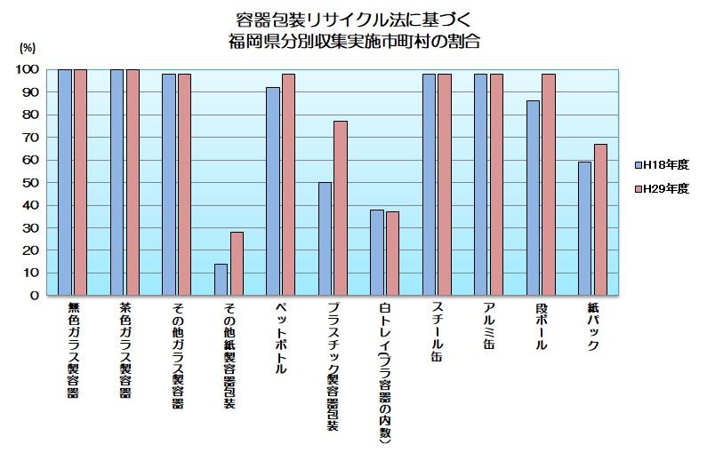 この法律に基づき、市町村は3 年ごとに分別収集計画を策定することとされており、計画策定を通じて、分別収集に取り組む市町村数及び品目数は、着実に増加しています。なお、平成25年度には、県内の全市町村において第7 期分別収集計画(平成26〜30年度)が策定されました。県においても、「福岡県第7 期分別収集促進計画」(平成26〜30年度)が策定され、市町村の分別収集が円滑に実施されるように、次のような取組を実施しています。 |