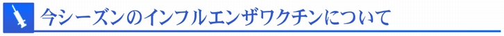 昨シーズンと同様、今シーズンのインフルエンザワクチンは、A/H1N1亜型(平成21年に流行した新型インフルエンザと同じもの)、A/H3N2亜型(いわゆる香港型)、B型の3つの型に効果のある混合ワクチンとなっています。