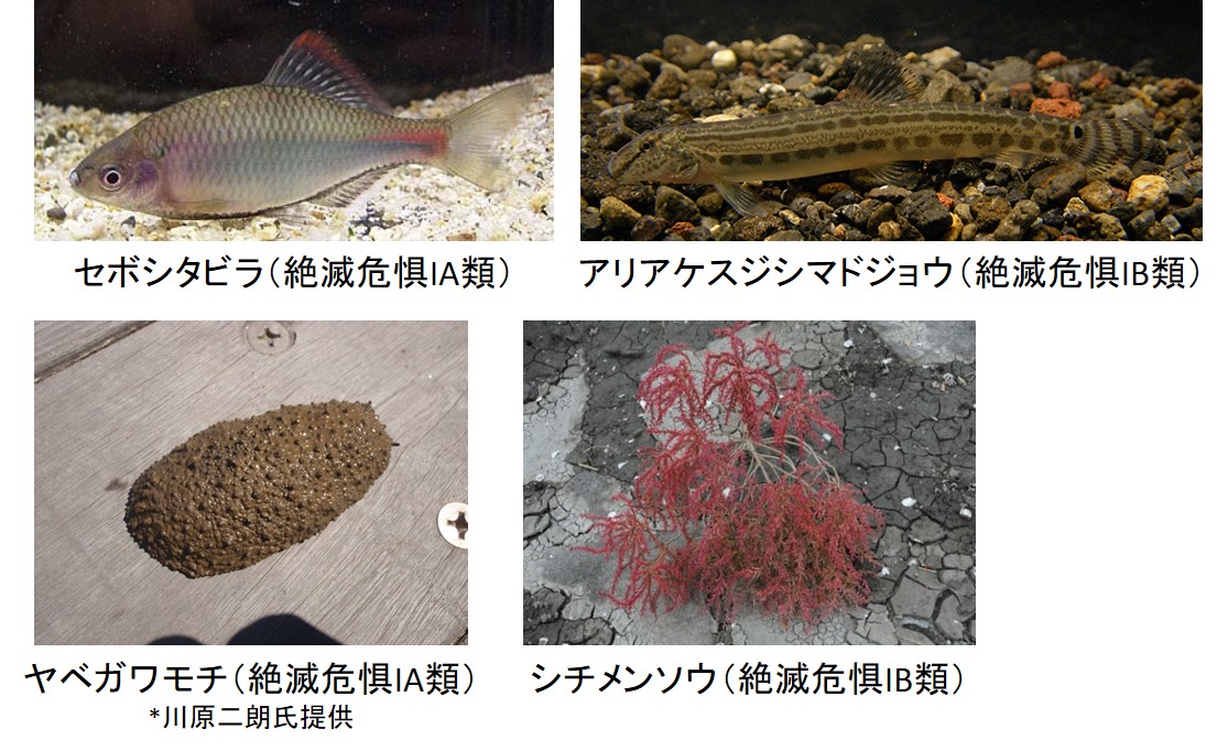 | *:維管束植物、その他植物、哺乳類、鳥類については福岡県レッドデータブック2011を、その他の分類群については福岡県レッドデータブック2014のカテゴリーを示す。 |