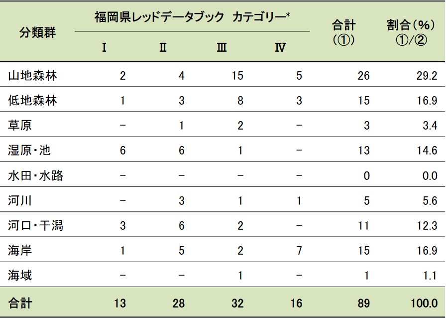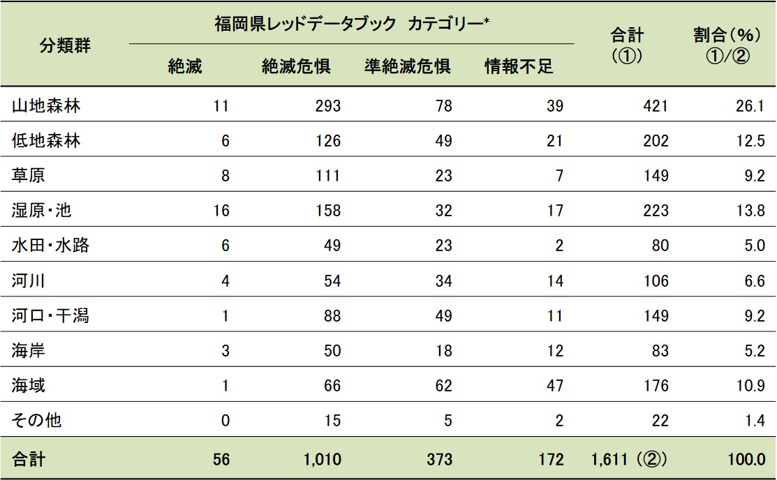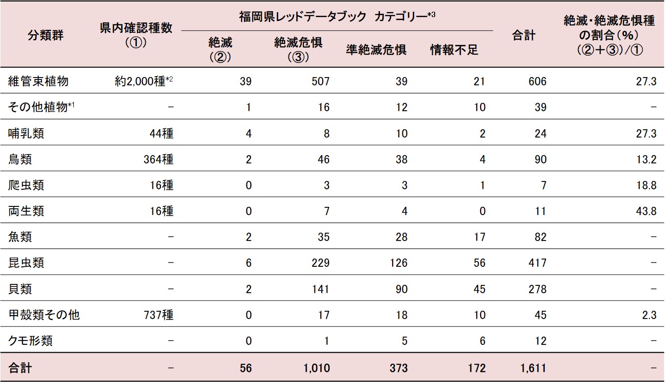| *1:蘚苔類、藻類、地衣類、菌類を指す *2:福岡県レッドデータブック2001で約2,300種と記載されているが、ここから外来種を除いた種数を示す *3:維管束植物、その他植物、哺乳類、鳥類については福岡県レッドデータブック2011を、その他の分類群については福岡県レッドデータブック2014のカテゴリーを示す |