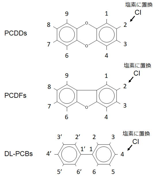 これらは毒性の強さがそれぞれ異なっており、PCDDの2と3と7と8の位置に4個塩素がついたもの(2,3,7,8-TCDD)がダイオキシン類の仲間で最も毒性が強いことが知られています。