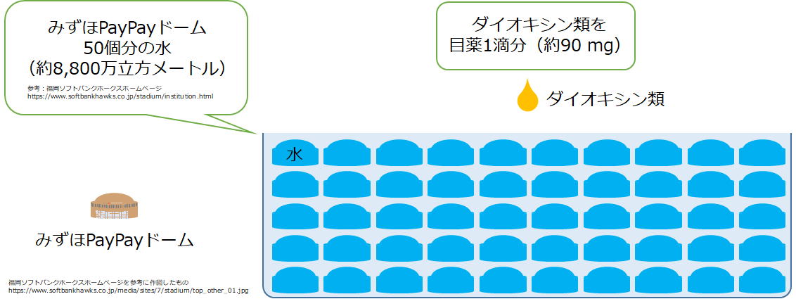 ダイオキシン類の重さと濃度を表すのに「ピコグラム」という単位が用いられます。1ピコグラムとは1グラムの1兆分の1(1/1,000,000,000,000)の重さです。では、水1リットル(L)あたり1ピコグラム(pg)のダイオキシン類とはどのくらいの濃度でしょう?これは、みずほPayPayドーム(約176万立方メートル)50個分の水に、目薬1滴分のダイオキシン類(約90 mg)を溶かしたものと大体同じです(目薬 1滴=0.05 mL、ダイオキシン類の比重を1.8として計算しました)。普段の生活とはかけはなれたとても薄い濃度ですが、ダイオキシン類はこれだけわずかな量で問題にされます。