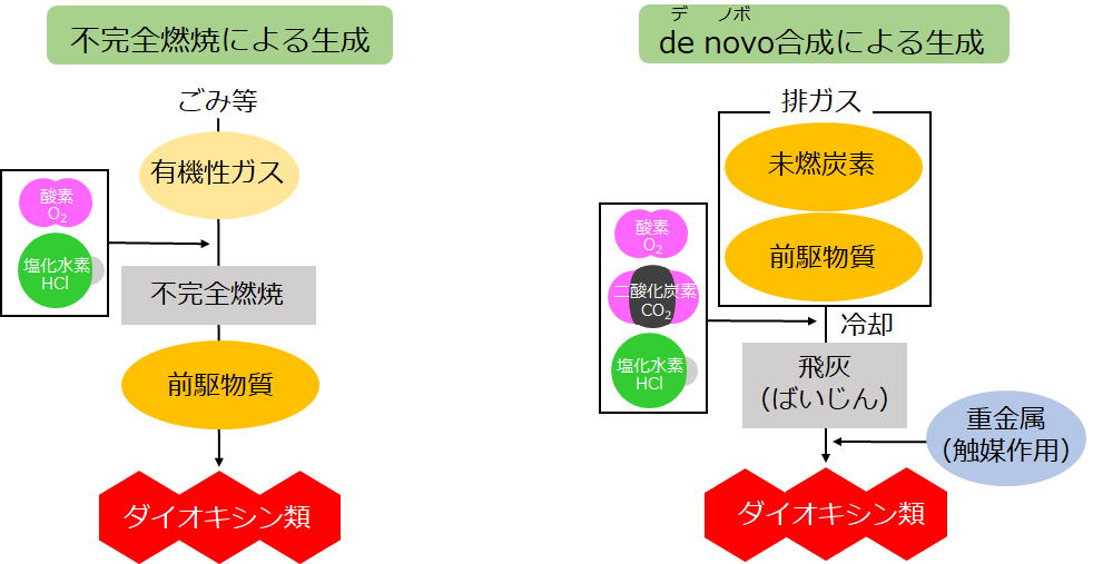 物が燃える時にダイオキシン類は自然に発生します。ダイオキシン類は様々なところで発生しますが、主な発生源は、ごみの焼却による焼却工程等の他、金属精錬の燃焼工程や紙などの塩素漂白工程などです。ごみの焼却場からのダイオキシン類が多い理由は、ごみを燃やすときに発生する有機性ガスが不完全燃焼したり、排ガスが300℃前後に冷却されるとき(de novo合成)にダイオキシン類ができやすいからです。