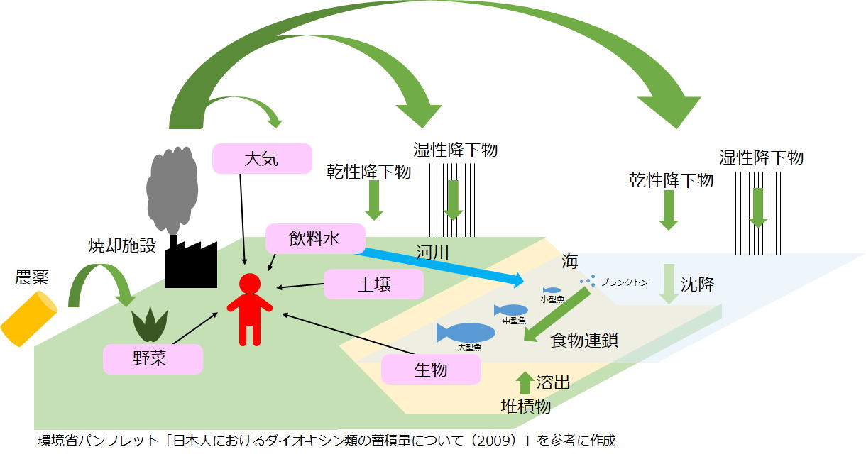 ダイオキシン類は、主としてものを燃やすところから発生し、処理施設で取りきれなかった部分が大気中に出ます。また、かつて使用されていたPCBや一部の農薬に不純物として含まれていたものが底泥などの環境中に蓄積している可能性があるとの研究報告があります。