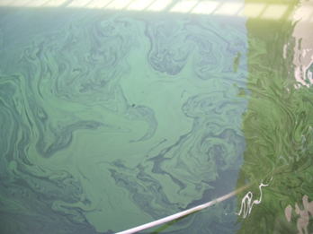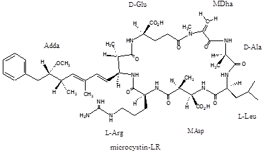 富栄養化した湖沼などではアオコとよばれる藍藻類の大発生がしばしばみられる。このアオコを形成する一部の藍藻類が強力な肝臓毒で,肝臓ガンのプロモータ活性を持つ環状ペプチドのミクロシスチン(MC)を生産することが知られています。